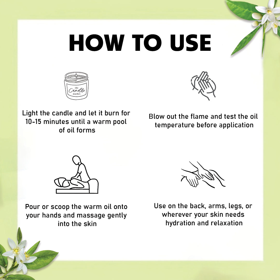 - Pour or scoop the warm oil onto your hands and gently massage it into the skin.